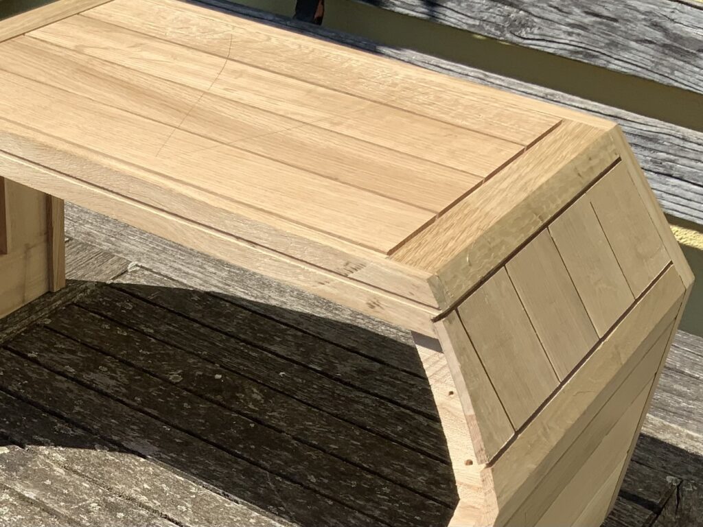 beplankt mit ca. 4 mm starken Leisten, die Kanten bzw. Ecken ummantelt mit Umleimern der jeweils passenden Holzart.