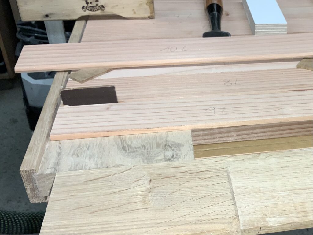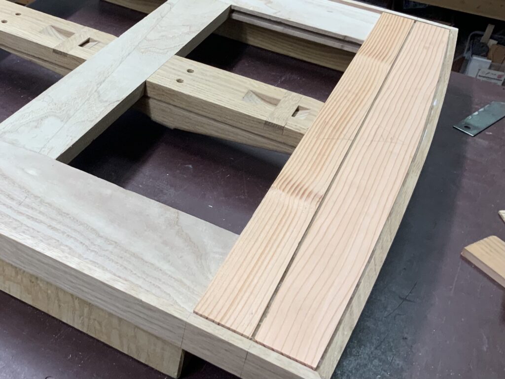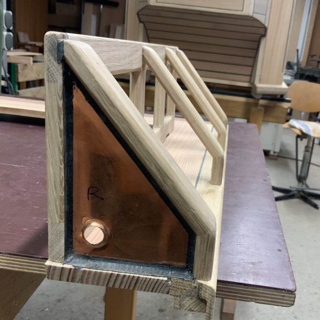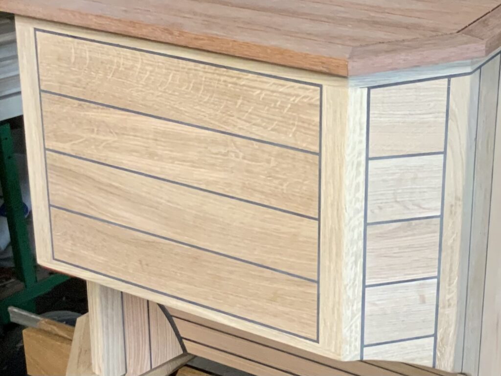 Vorbau („Handschuhfach“) mit Eiche-Plättchen beplankt vor der Verfüllung der Fugen