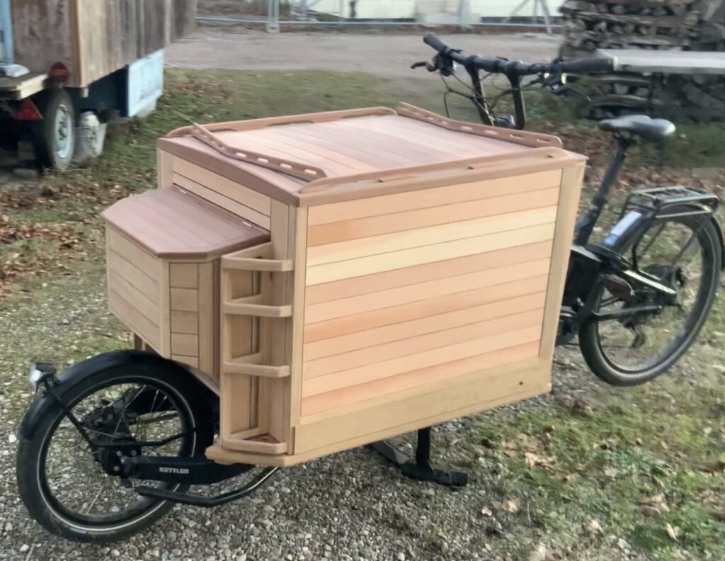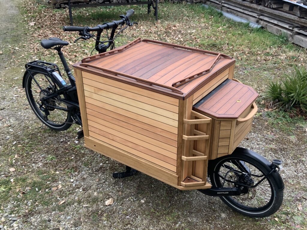 die Mittelstrebe zur Befestigung an der Lenksäule des Lastenrads (Bohrlöcher) ist ebenfalls aus Eiche