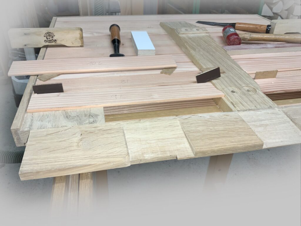 Beginn der Beplankung mit 4 mm starken Lärche-Brettchen.